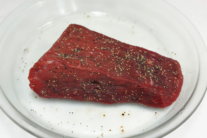 牛肉に塩、こしょうを強めにふり、おろしにんにくをすり込んで下味をつける。